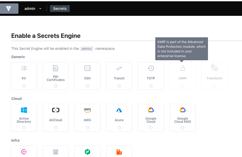 KMIP is available with HCP Vault Plus-tier. Perhaps, your cluster is not a plus-tier?