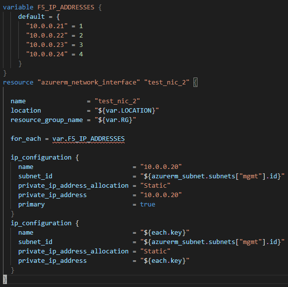 I am trying to create a NIC in Azure with multiple assigned IP addresse using the for_each to iterate the ip_configuration. However, the resulting configuration in Azure is only the primary IP address and the second IP address in the for_each loop. Could someone help me understand why this is happening and what is the proper way to do this?